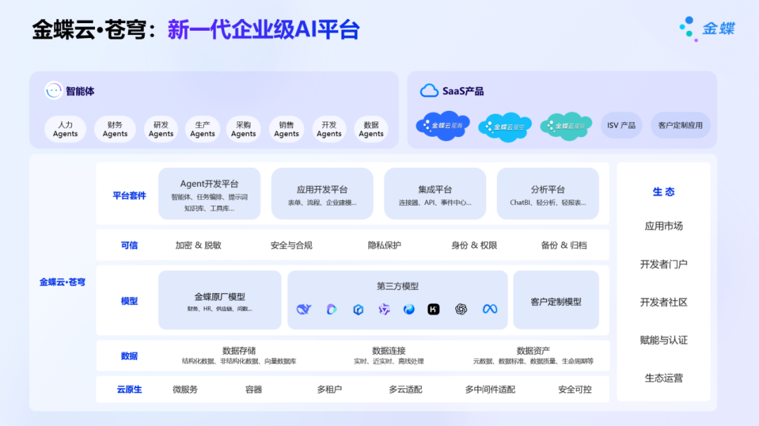 金蝶的突破在于将AI能力深度嵌入平台内核,金蝶云·苍穹作为新一代企业级AI平台,基于对行业变革的深度理解,以模型驱动与复合AI技术为核心、提供Agent开发平台、应用开发平台、集成平台、分析平台等平台套件,降低AI技术应用门槛,支撑企业多元化业务以及业务智能创新,实现IT民主化。