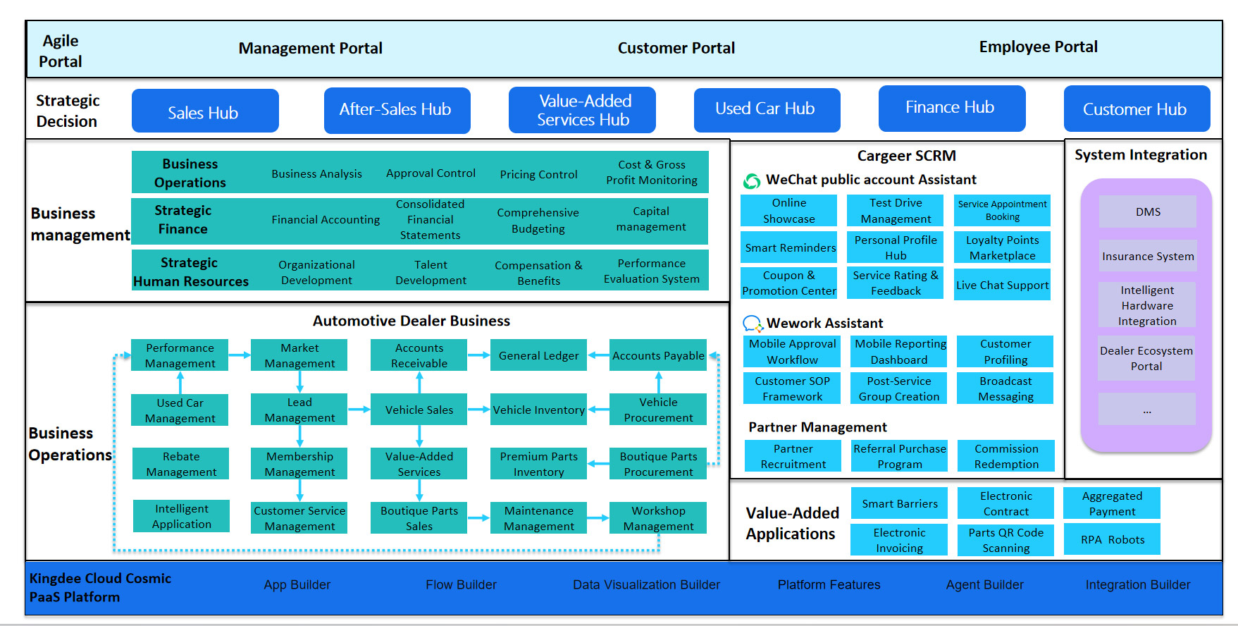 دمج عمليات النشاط التجاري الكاملة لمتاجر 4S (العملاء المحتملون، مبيعات المركبات، تعديلات الأقساط، صيانة ما بعد البيع، أعمال السيارات المستعملة، متابعات خدمة العملاء، خدمات العضوية) للتخلص من صوامع المعلومات.
